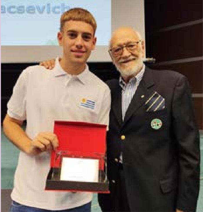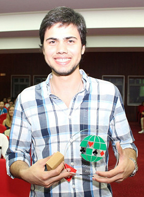 Our first award goes to someone who typifies the definition of a suitable candidate: cheerful, outgoing, and helpful, with an enthusiasm for both the game of bridge and life in general, which is infectious. This candidate was nominated by players of several different nationalities. He has taken trouble to assist in improving things, both big and small, without being too critical. He speaks several languages, and has been one of the most helpful people in the Camp. He participates fully in the activities but has also found time to write articles for the Daily Bulletin, and clean up the room at the end of play. Aged 23, he is studying medicine at the University of Lausanne. We welcome Andrei Mihailescu of Switzerland.