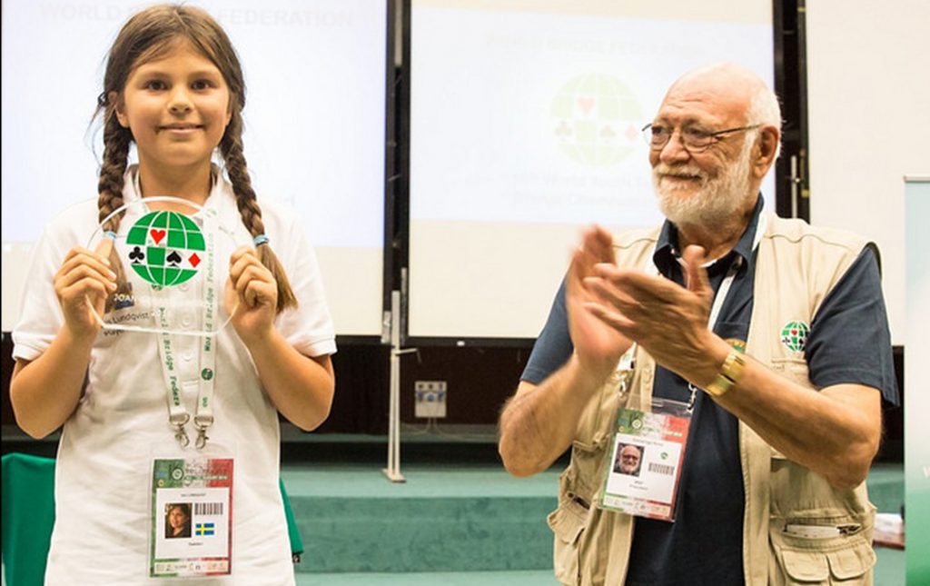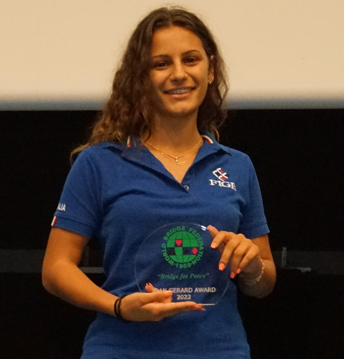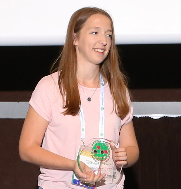 It is always pleasing when a bridge player – particularly a good one, with every chance of doing well in the Tournaments – chooses to play with younger, inexperienced players, rather than with the better participants with whom it might be possible to win. This kindness and wish to encourage and bring on the weaker players combined with a gentle and positive attitude makes this person an ideal recipient of the WBF Award. Away from the bridge table, she has also demonstrated great thoughtfulness and a caring attitude for all participants in the Camp, whatever their position, age or nationality. Young players, wishing to learn but normally afraid of the better players, can all find shelter with Julia Korus of Germany.
