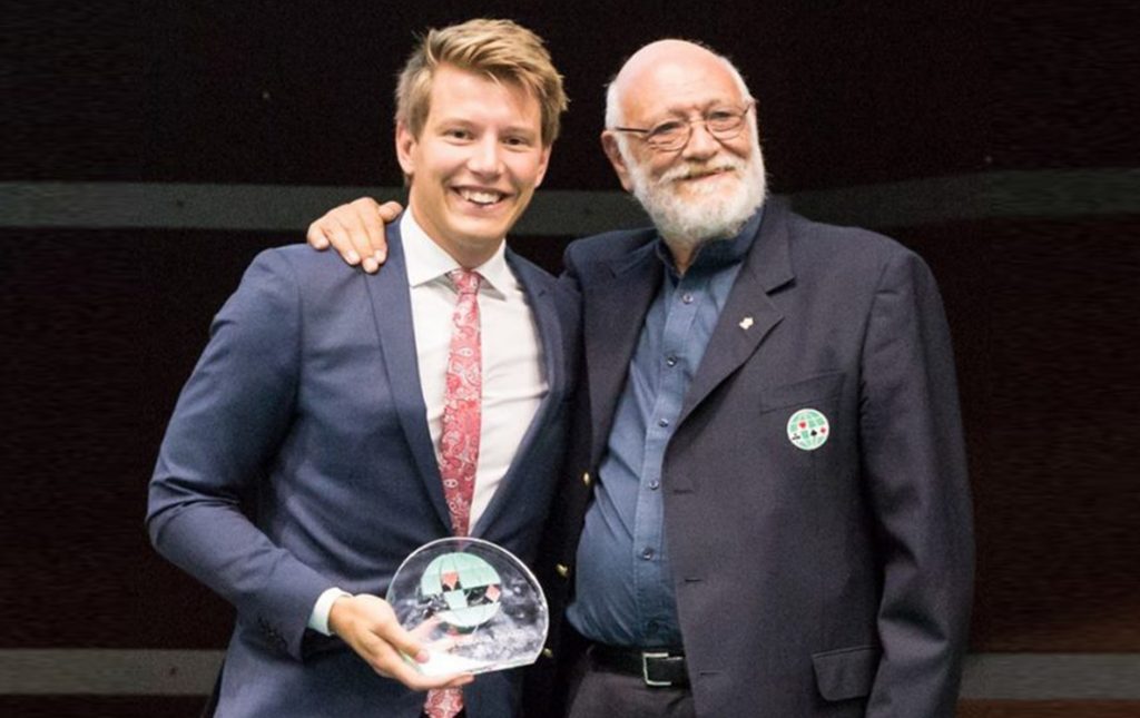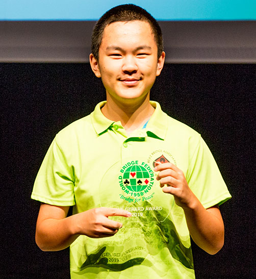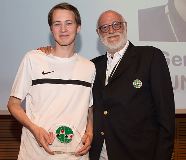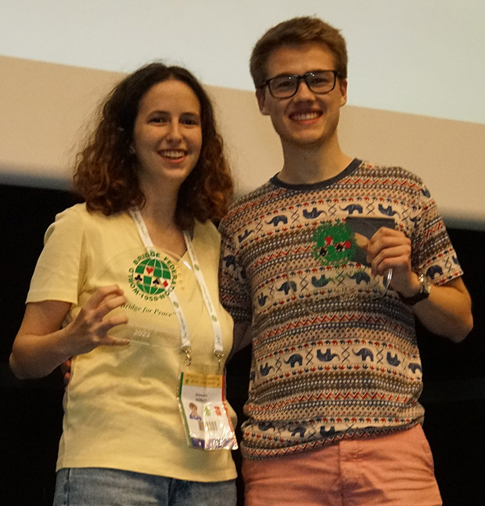 Our final award is made to a young man who exemplifies the WBF award scheme. He is enthusiastic and is one of those rare people who light up a room when they enter. The warmth of his personality is infectious and puts everyone at ease. His courteousness, generosity and helpful nature have endeared him to everyone. He was nominated in considerable numbers, clear evidence of the remarkable impression he has made. He is studying to be technical engineer and teaches ‘oldies’ bridge. Please show your appreciation for the 22 year old Thomas Schønfeldt from Denmark.