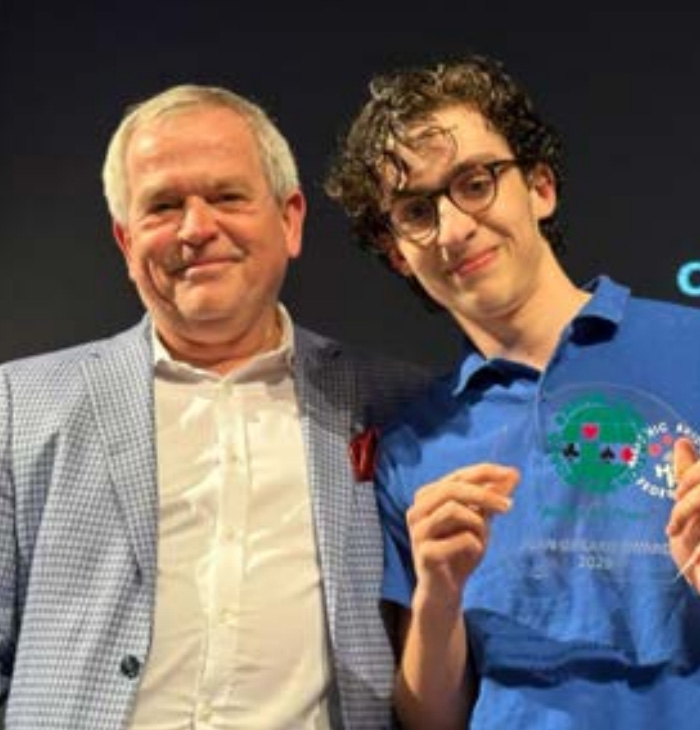 First comes a player who stands out because he always has a smile on his face. He plays with partners of all ranks, and though he is a fine player he does not show his superiority at the table. Since his first appearance, he has adopted the Camp spirit and worked for its success, whether by participating, helping fellow Juniors or giving a hand (bridge or otherwise) to the organizers. He is friendly to everyone, generous, and popular. For all these reasons, we are very pleased to honour Niek Brink.